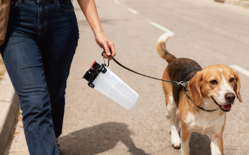 Features | .Leak proof design, Food-grade silicone waterproof cushion prevents water leakage. .This bottle is designed into two chambers, dog water bottle and food storage container。 .The groove design is convenient for the women to hold steady, and you can feed your pets according to the amount through the scale design. .Large capacity : 250g/7oz capacity for food, and 350ml/12oz capacity for drinking water. . Lightweight, durable amd reusable. |
